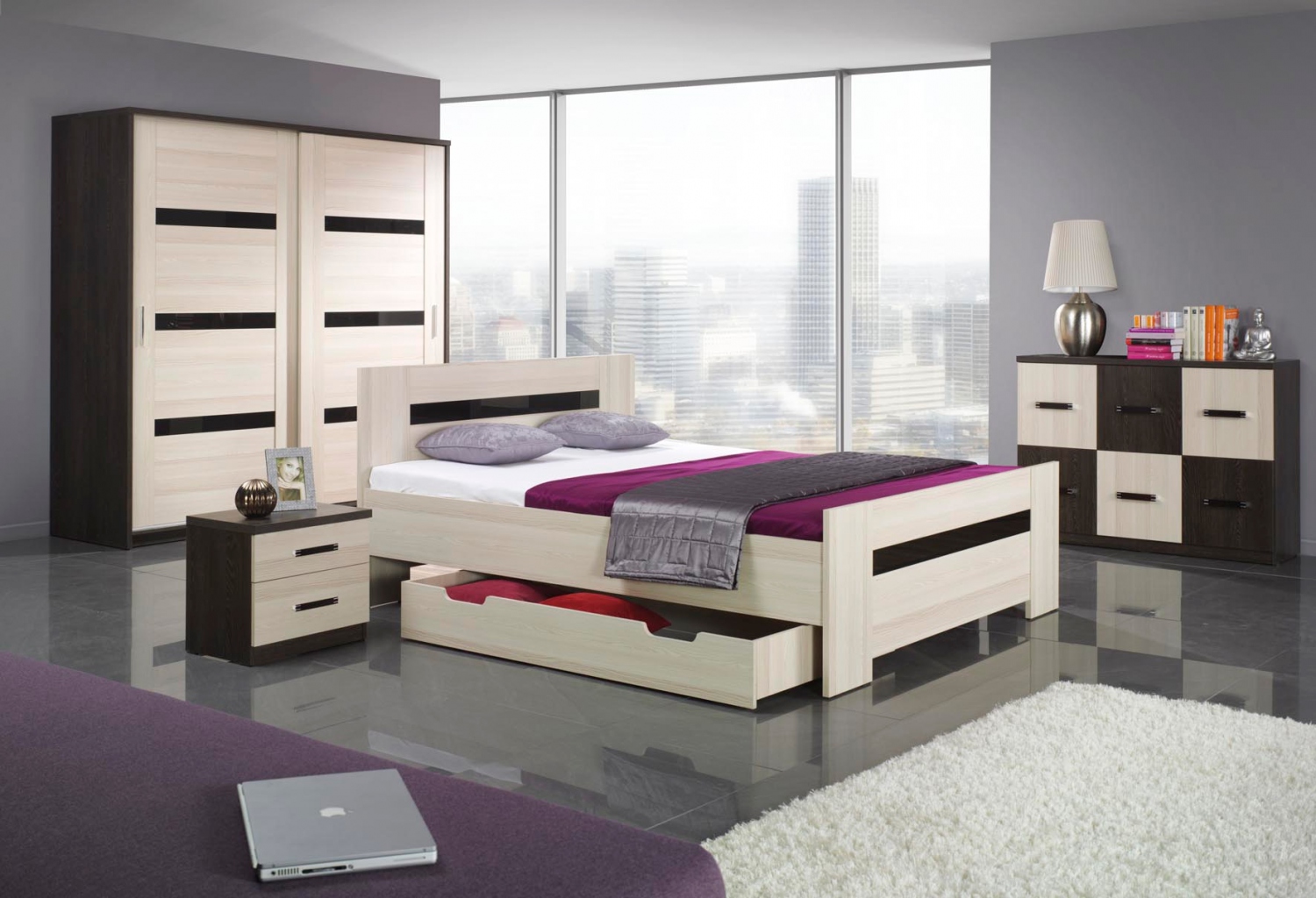 Elegantní sestava do ložnice s prostornou manželskou postelí. Klasická ložná plocha postele o rozměru 200 x 160 cm. Úložný šuplík a rošty jsou součástí postele. Ložnice obsahuje odkládací komodu, manželskou postel s šuplíkem, dva noční stolky a velkou šatní skříň s posuvnými dveřmi.