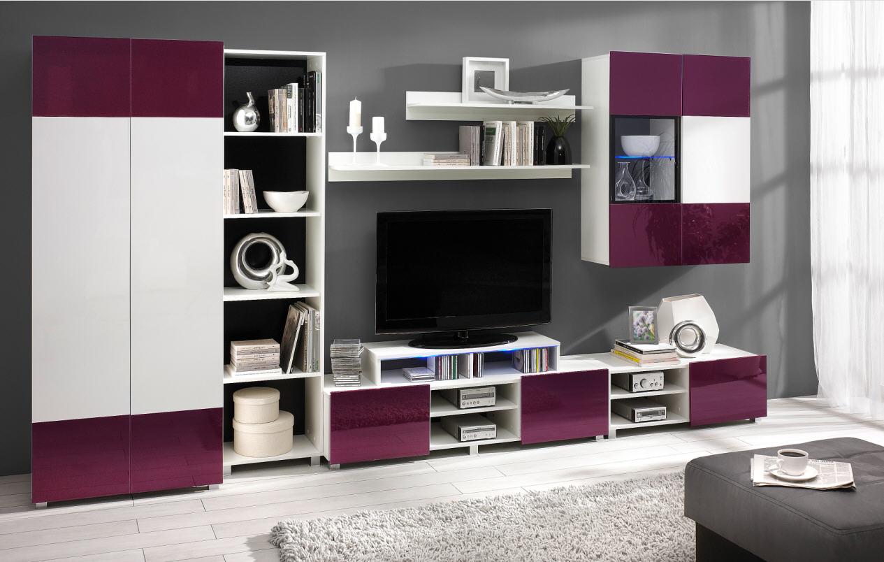Moderní vzhled, čisté linie, tak by se dala pojmenovat uvedená obývací stěna. Fialovo bílé provedení bude dominantou vašeho interiéru. Tuto barevnou variantu lze doplnit pouze decentními barevnými prvky. Na výběr jsou i další barevné varianty, ze kterých si může zákazník vybírat. Přední panely skříněk a šuplíků mohou být v matném či lesklém provedení. V ceně sestavy je i modré osvětlení u vybraných dílů, dodá celé sestavě originalitu. Závěsná skříňka s menší vitrínou je opatřena skleněnou policí.