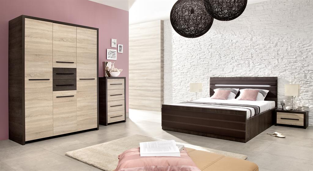 Moderní ložnice v příjemném hnědém odstínu přímo vybízí k hození všech starostí za hlavu a oddání se odpočinku a relaxaci po náročném pracovním dni. Kromě komfortní manželské postele a praktických nočních stolků sestava zahrnuje také stylovou šatní skříň a šuplíkovou komodu, do nichž můžete přehledně uložit veškeré šatstvo. Nápadité dvoubarevné provedení vnese do interiéru jemnou eleganci.