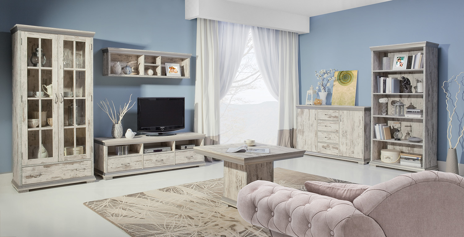 Střed sestavy tvoří televizní stolek, jenž kromě prostorné povrchové desky nabízí také tři otevřené sektory a výsuvné šuplíky. Oblíbené předměty vystavíte do velké prosklené vitríny. Regál se čtyřmi vloženými policemi pak poslouží jako knihovna. Spoustu úložného prostoru nabízí kombinovaná komoda s dvěma skříňkami a čtyřmi pojízdnými zásuvkami. Celkový vzhled a multifunkčnost doplňuje konferenční stolek a závěsná police.