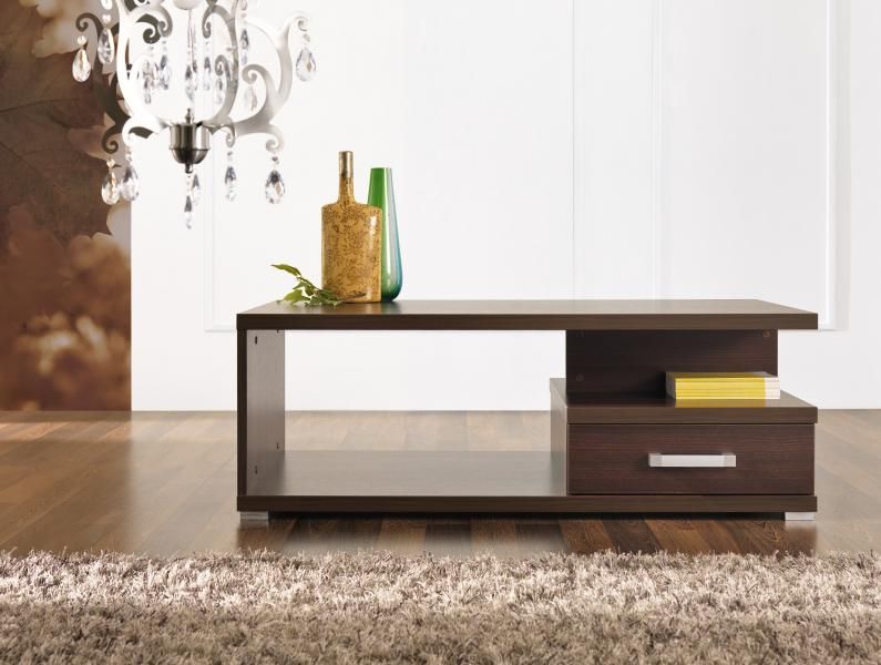 Stylový konferenční stolek, doplněn o jeden úložný šuplík na úschovu drobností. Atypický design oživí váš interiér a dodá mu moderní šmrnc. Na obrázku je stolek vyobrazen v tmavém provedení wenge, zakoupit lze i druhou variantu a tou je švestka, která disponuje výraznou strukturou dřeva. Odkládací plochu pod vrchní deskou využijete na odložení novin, časopisů a podobných doplňků. Konferenční stůl je vyroben z LTD materiálu, který se vyznačuje mnoha kladnými vlastnostmi.